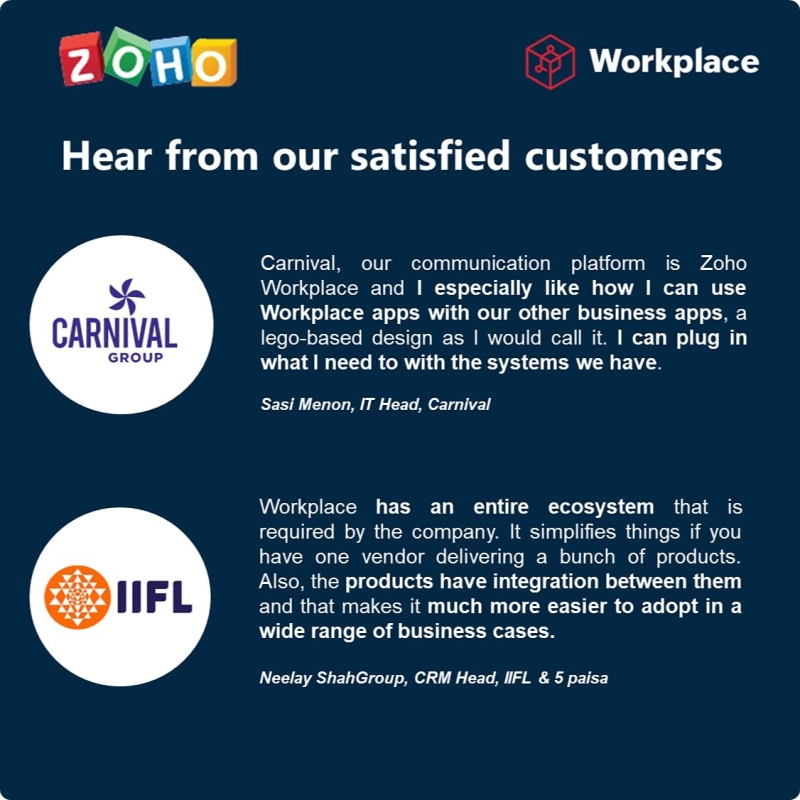 • Connect and collaborate with your team using online meetings, Email, Cliq. Securely create, store and manage files with Zoho Workplace, a better priced solution for your business